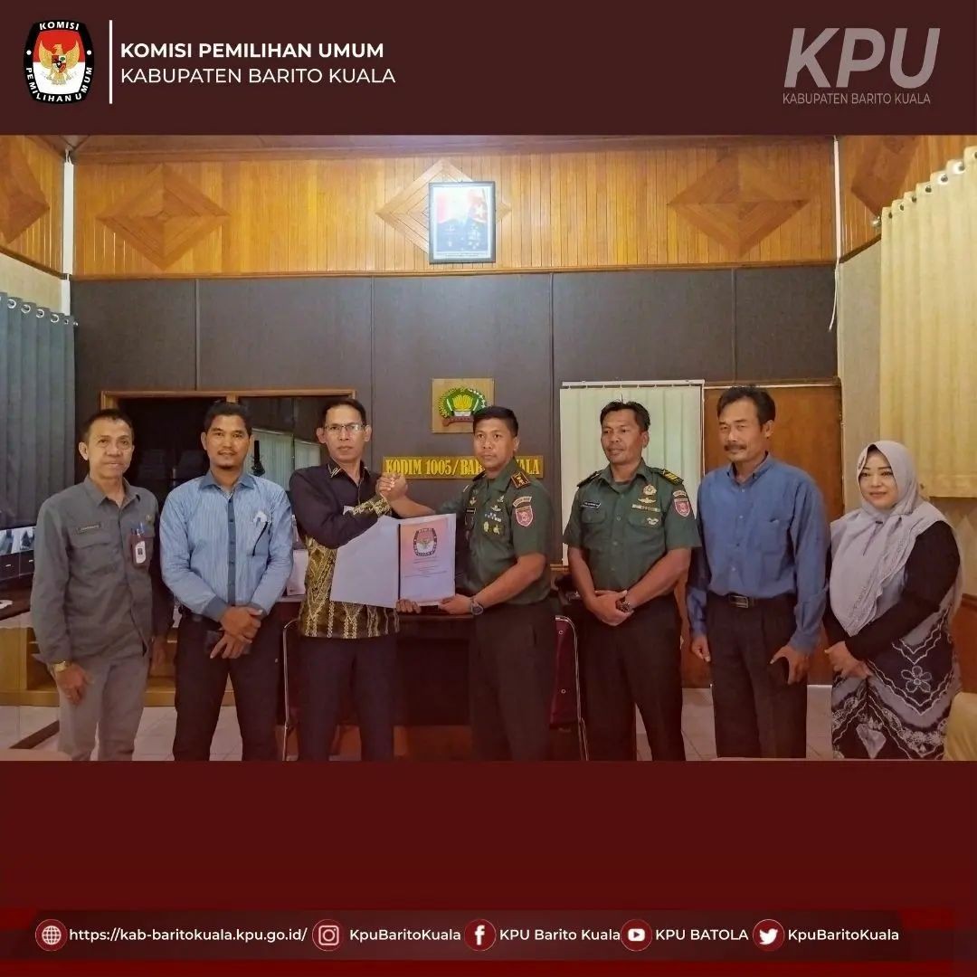 Menjelang bergulirnya Tahapan Pemilu Serentak Tahun 2024, Komisi Pemilihan Umum Kabupaten Barito Kuala terus melakukan koordinasi dengan berbagai pihak. Usai mengunjungi Pemerintah Kabupaten Barito Kuala beberapa waktu lalu, KPU Kabupaten Barito Kuala melanjutkan kunjungannya dengan menyambangi Dandim 1005/Marabahan, yang bertempat di Kodim 1005 Marabahan, pada Rabu 29 Juni 2022 pukul 11.00 WITA. Kunjungan tersebut disambut baik oleh Dandim 1005 Marabahan. Ketua KPU Kabupaten Barito Kuala, Rusdiansyah, S.P mengatakan, kunjungan tersebut merupakan rangkaian dari koordinasi yang dilakukan oleh KPU Kabupaten Barito Kuala untuk beberapa waktu kedepan. Dalam pertemuan ini Dandim 1005 Marabahan mengungkapkan, pihaknya menjamin netralitas anggotanya dalam penyelenggaraan Pemilu Serentak Tahun 2024. Dalam penyelenggaraan Pemilu Serentak 2024, pihaknya menambahkan akan selalu berkomitmen dan bekerjasama dengan pihak Kepolisian untuk membantu menciptakan suasana Pemilu yang aman dan kondusif. Pihaknya juga berharap semoga Pemilu Serentak 2024 nanti bisa berjalan dengan tertib, aman, dan damai serta jauh dari hal-hal yang berpotensi menimbulkan kegaduhan. Hasil dari pertemuan tersebut baik KPU Kabupaten Barito Kuala dan Kodim 1005 Marabahan siap bekerja sama dalam mensukseskan Pemilu Serentak Tahun 2024 di Kabupaten Barito Kuala.....